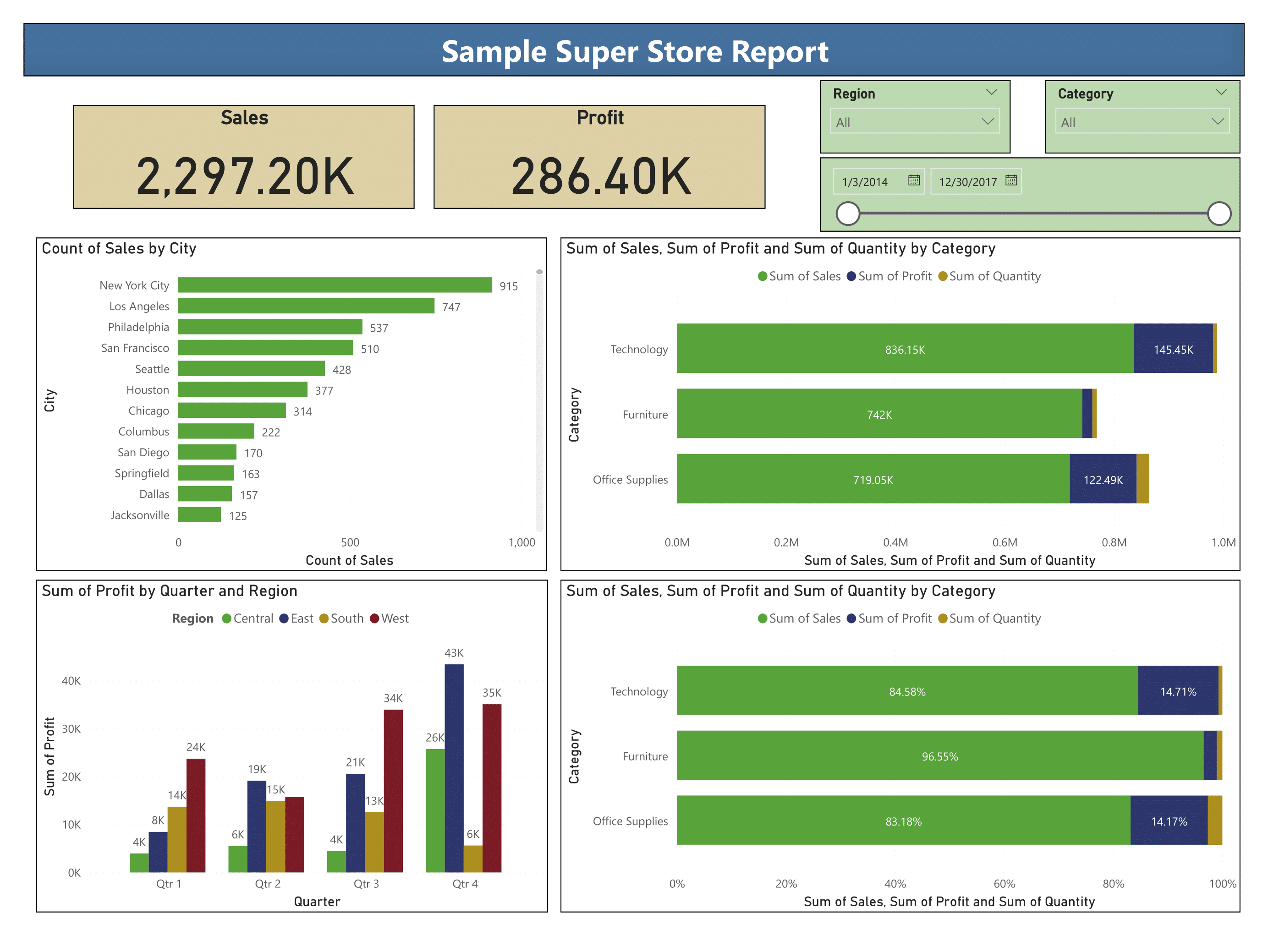 The following dashboard uses the Sample - Superstore dataset to demonstrate the creation of: